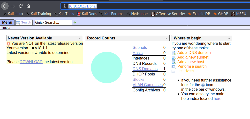 Not live. Not for production use. Interesting. It's still in development. This is probably our hint to keep looking. Eventually, if we click around enough, we hit the "login" link and are taken to: "http://10.10.10.171/ona/." I would imagine there may be a wordlist out there with this, but it's nice to see that it's reachable with persistent searching through the webpages.