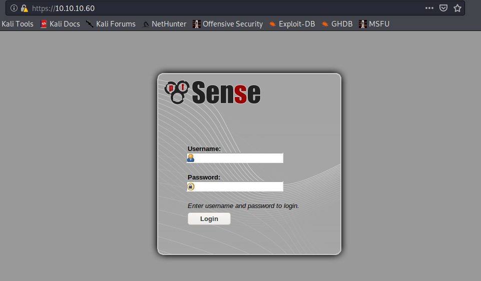 Cool. Let's try a few dumb creds like admin:admin, and admin:pfsense (the default PFSense creds). No dice.