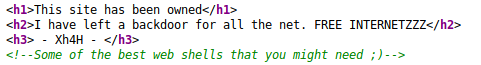 OpenSSH 7.6p1 Ubuntu 4ubuntu0.3 (Ubuntu Linux; protocol 2.0)The interesting thing here is the banner that reads, "OWNED BY XH4H" when we attempt to log in.