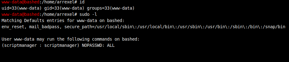 www-data@bashed:/$ alias bruh="sudo -u scriptmanager"Now when I type bruh followed by a command, I automatically run it as scriptmanager: